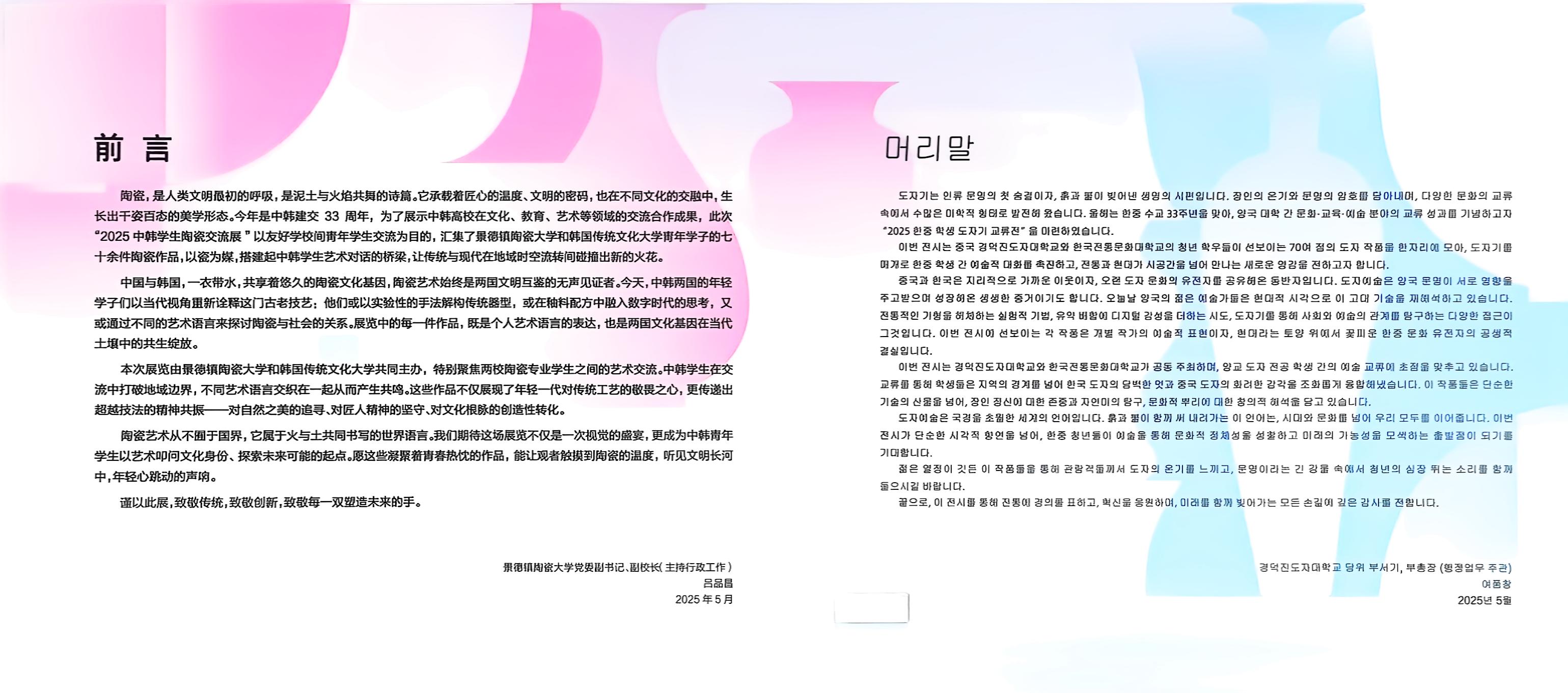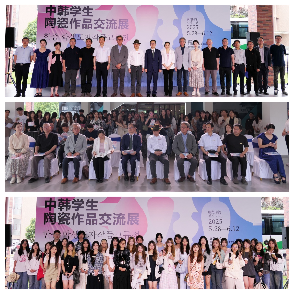 5月28日上午,2025中韩学生陶瓷作品交流展在景德镇陶瓷大学湘湖校区博物馆开幕。景德镇陶瓷大学党委副书记、副校长(主持行政工作)吕品昌、韩国传统文化大学校长姜敬焕分别致辞,景德镇陶瓷大学党委常委、副校长陈云霞,校党委常委、党委组织部部长杨志民,韩国传统文化大学研究生院院长崔成在等出席了开幕式。
