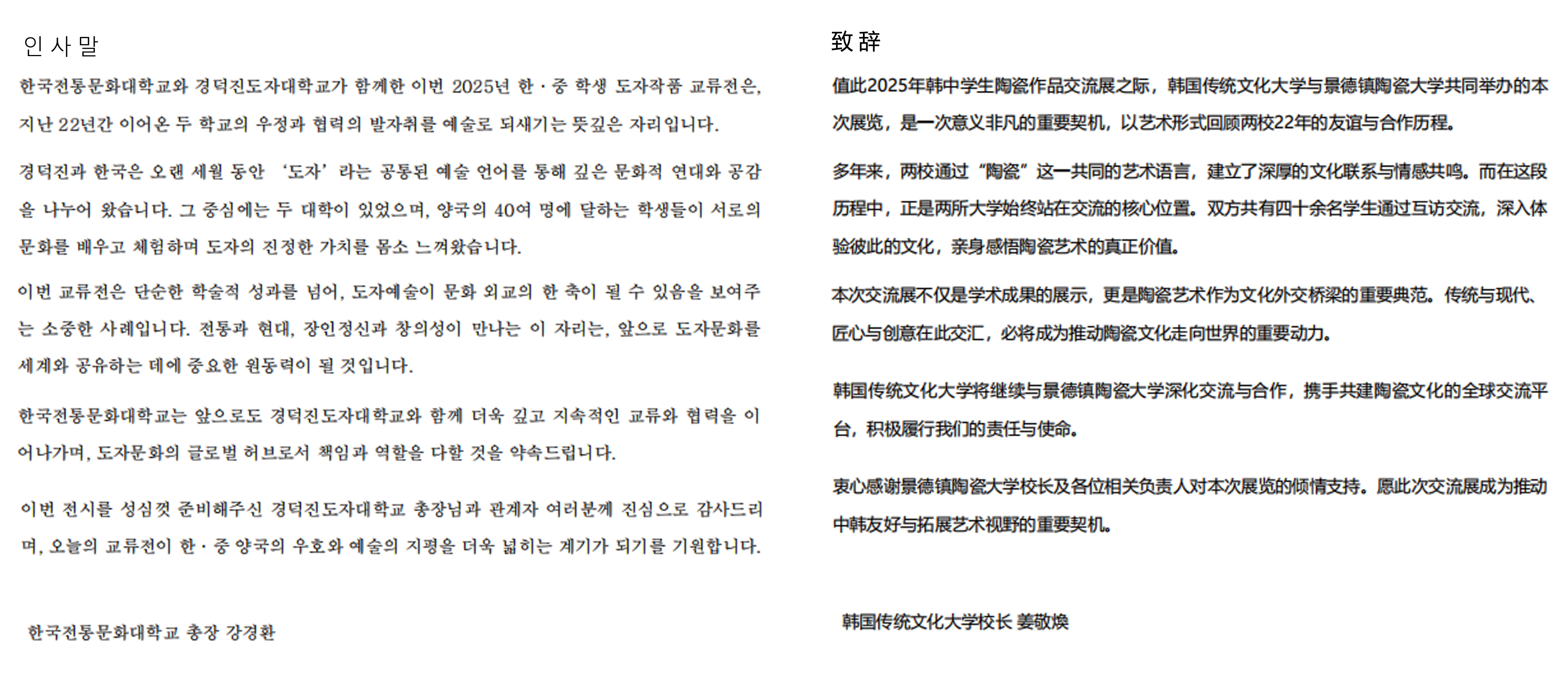 姜敬焕在致辞中表示,此次陶瓷交流展是见证两校交流与合作足迹的珍贵契机。中国与韩国均拥有悠久的陶瓷文化传统,而景德镇更是世界陶瓷的核心地区,本次展览将成为共同探索两国陶瓷历史与造型艺术之美的特殊平台,这不仅是艺术作品的展示,更是两校对传统进行现代诠释、交流美学与技艺的丰硕成果。祝愿两校友谊长存、携手同行共赴未来。