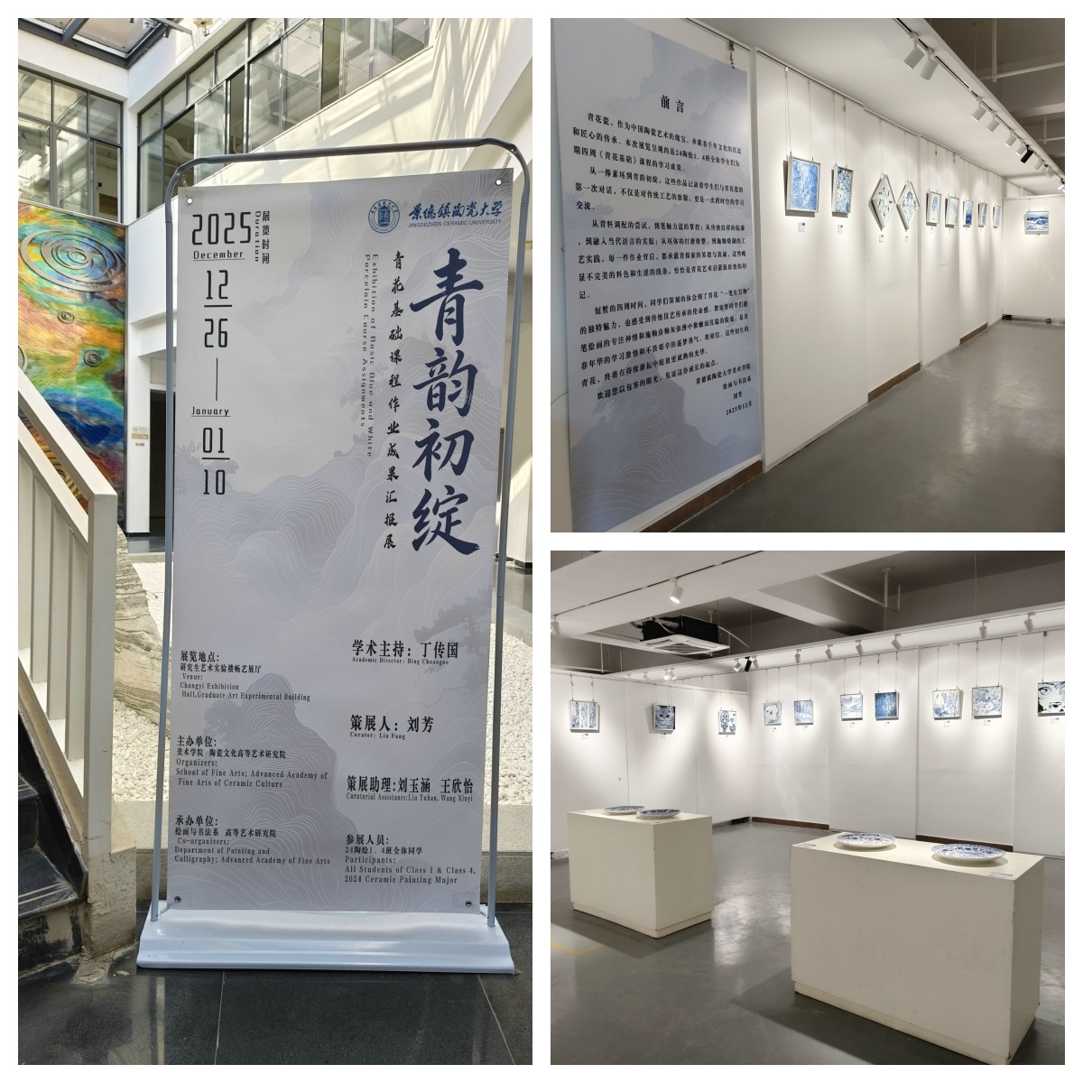 12月26日,“青韵初绽”青花基础课业成果汇报展在景德镇陶瓷大学研究生艺术实验楼畅艺展厅如期开展。本次展览集中呈现了美术学院24陶绘1班与4班全体同学本学期青花基础课程中的优秀创作,是同学们青花艺术初体验的阶段性学习总结。参展作品风格独特、题材丰富、技法扎实且富有表达张力,充分展现出同学们饱满的学习热情与对青花艺术的真挚热爱。此次展览由美术学院与陶瓷文化高等研究院联合主办,绘画与书法系、中国陶瓷文化研究所共同承办,学术主持为绘画与书法系主任丁传国教授,策展人为陶瓷绘画教研室刘芳副教授,策展助理由24陶绘专业本科生刘玉涵与王欣怡担任。